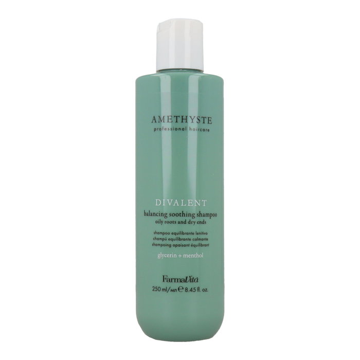 Champú profesional equilibrante para cabellos divalentes: raíces grasas y largos secos. Reduce el exceso de grasa hidrata las puntas y deja el cabello ligero limpio y manejable sin resecar.