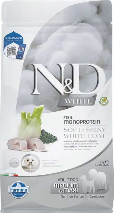 Farmina N&D White Dog Lubina Spirulina Med-Maxi es alimento para perros de tamaño mediano y grande de la reconocida marca Farmina. Este saco contiene 2 kg de producto. La fórmula está basada en lubina y espirulina, ingredientes de alta calidad. La receta N&D White Dog es parte de la gama de alimentos naturales libres de transgénicos de Farmina, diseñada para ofrecer nutrición específica. Ideal para perros adultos de razas medianas a grandes que requieren una dieta equilibrada y rica en proteínas.