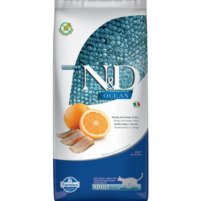 Alimento completo y equilibrado para gatos adultos de la línea N&D Ocean de Farmina, con Arenque como ingrediente principal. Formulado para ofrecer una nutrición óptima a tu felino, este producto de 10 kg proporciona una fuente de proteínas de alta calidad y ácidos grasos esenciales para la salud y el bienestar de tu mascota. Farmina garantiza ingredientes seleccionados y una receta cuidada para satisfacer las necesidades nutricionales de tu gato.