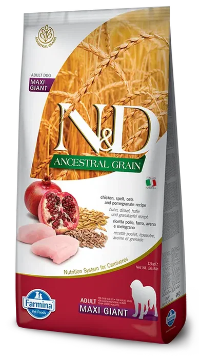 Farmina N&D Dog Ancestral Gigante Pollo 12 kg. Descubre la alimentación ancestral adaptada para perros de raza gigante. Este saco de 12 kg de Farmina ofrece una fórmula completa basada en pollo, diseñada para satisfacer las necesidades nutricionales específicas de los perros de gran tamaño, promoviendo su salud y bienestar en todas las etapas de la vida. La receta Ancestral Grain de la gama N&D combina ingredientes de alta calidad para una nutrición óptima.