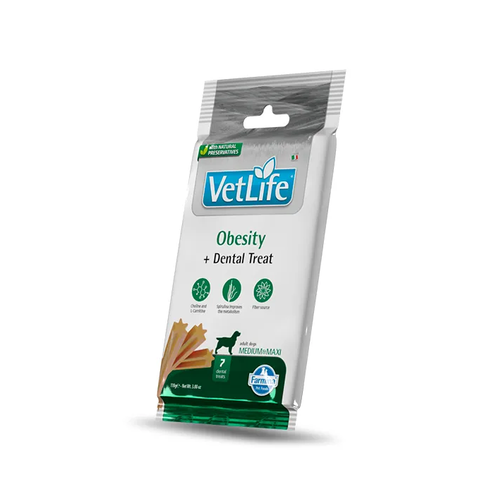 El producto Farmina Treat Vet Life Dog Obesity Adult Med-Max es un alimento diseñado específicamente para perros adultos con problemas de obesidad. Cada paquete contiene 15 unidades de 110 gramos cada una, totalizando 1650 gramos de producto. Formulado por Farmina, esta línea Vet Life se enfoca en el manejo nutricional de condiciones específicas de salud, como la obesidad en perros de tamaño mediano a maxi. Estos premios son una opción para complementar la dieta de perros que necesitan controlar su peso, siempre bajo supervisión veterinaria.