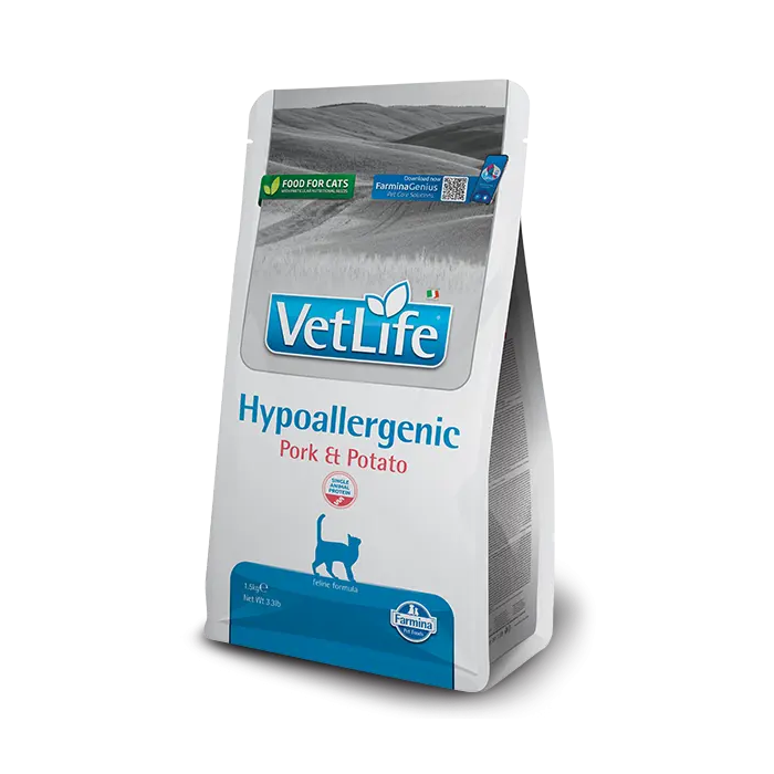 Alimento veterinario completo para gatos adultos formulado para reducir la intolerancia a ingredientes y nutrientes. Farmina Vet Life Hypoallergenic Cerdo Adult es una dieta de eliminación especialmente diseñada para gatos con sensibilidades alimentarias. Su fórmula se basa en una única fuente de proteína animal (cerdo) y una única fuente de carbohidratos (guisantes), lo que ayuda a minimizar el riesgo de reacciones alérgicas. Este alimento contribuye al bienestar digestivo y a la salud de la piel y el pelaje de tu gato adulto. Presentación de 400 gr.