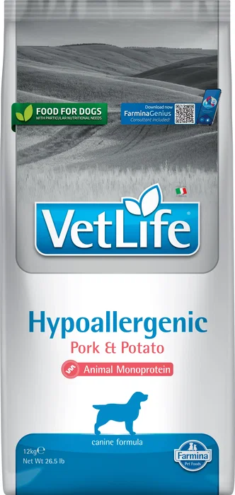 Farmina Vet Life Dog Hypoallergenic Cerdo Adult es un alimento seco para perros adultos, presentado en un práctico formato de 12 kg. Formulado específicamente con cerdo como fuente proteica única, pertenece a la gama hipoalergénica de la prestigiosa marca Farmina. Esta dieta está diseñada para minimizar el riesgo de reacciones adversas a los alimentos, siendo una opción ideal para perros con sensibilidades o intolerancias alimentarias. El producto Vet Life Hypoallergenic Cerdo de Farmina proporciona una nutrición completa y equilibrada para apoyar el bienestar general de tu perro adulto.