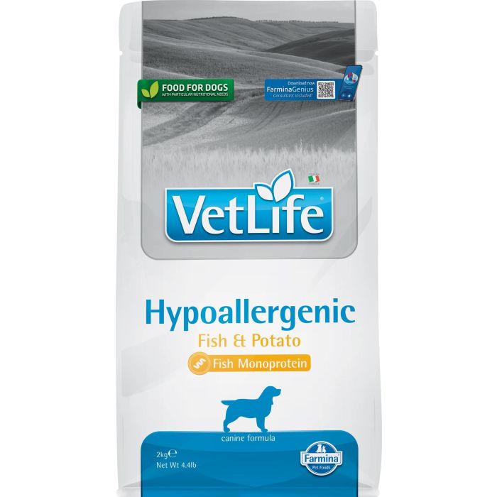 Alimento dietético completo para perros, formulado para reducir las intolerancias alimentarias. Farmina Vet Life Hypoallergenic Fish & Potato se basa en pescado y patata, ingredientes seleccionados por su bajo potencial alergénico. Es ideal para perros con sensibilidades alimentarias y también se recomienda para apoyar la función trófica de la piel y sus apéndices, incluyendo ojos, oídos y sacos anales.