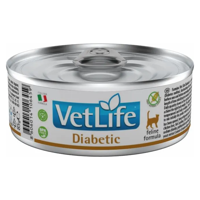 Alimento completo y equilibrado para gatos adultos con diabetes. Farmina Vet Life Natural Diet Cat Diabetic está formulado con ingredientes de alta calidad para ayudar a controlar la glucosa en sangre de tu gato.
