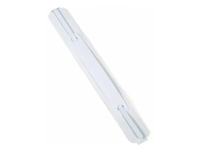 Fástener metálico plastificado autoadhesivo en la parte posterior. Color blanco. Medidas: 38 x 158 mm.