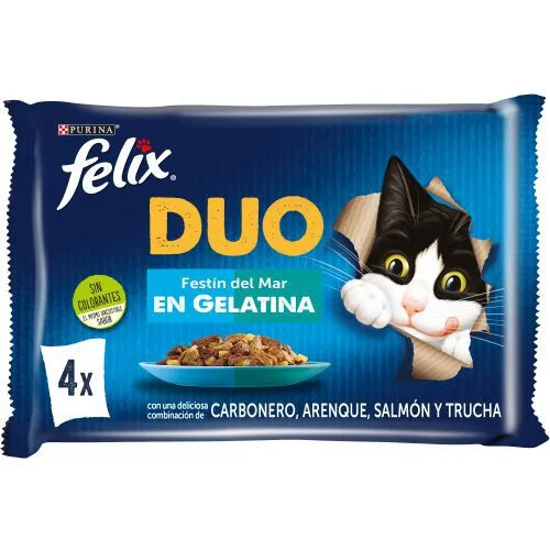 PURINA FELIX FANTASTIC DUO Festín del Mar. 4 sobres de 85g. Comida húmeda para gato con tiernos trocitos de pescados en una suculenta gelatina. Marca: Purina.