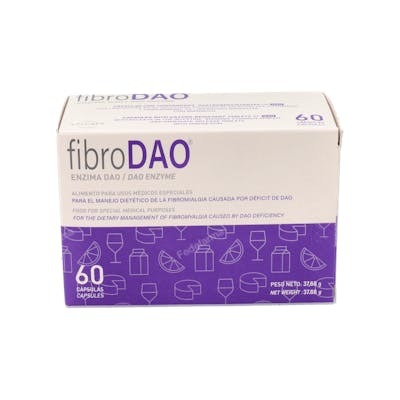 Composicion: Celulosa microcristalina e hidroxipropilcelulosa; óxido de magnesio (magnesio); almidón de patata; Agentes de glaseado: etilcelulosa e hidroxipropilmetilcelulosa; Extracto de proteína de riñón de cerdo al 7% Diamina oxidasa (DAO); almidón de arroz; Estabilizadores: sales de magnesio de ácidos grasos, alginato de sodio y ácido esteárico; Cadena media triglicéridos y ácido oleico; Agente de glaseado fosfato dicálcico; manzana concentrada, grosella negra y rábano, espirulina y manzana. Cápsula vegetal: hidroxipropil metilcelulosa fibroDAO. Por 1 cápsula: DAO: 0,3 mg Magnesio: 80 mg