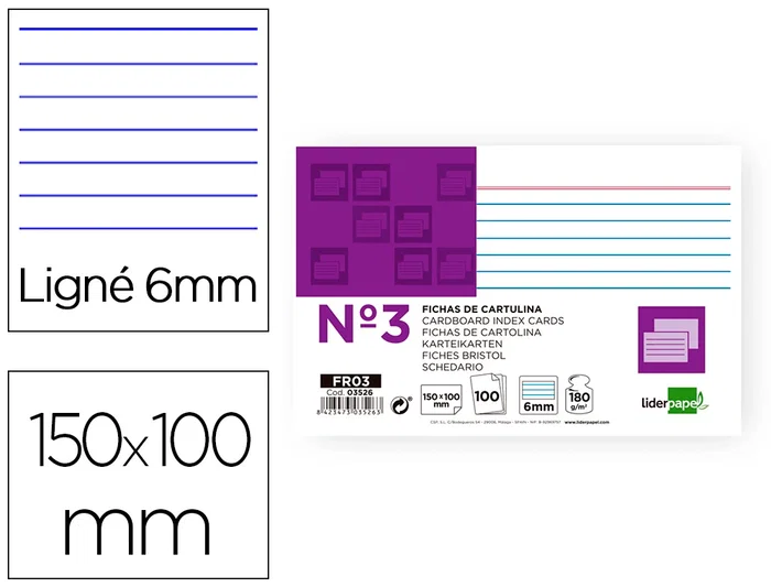 Fichas rayadas y lisas. Cartulina de 180 g/m². Ideal para fichas bibliográficas. Paquetes de 100 hojas.
