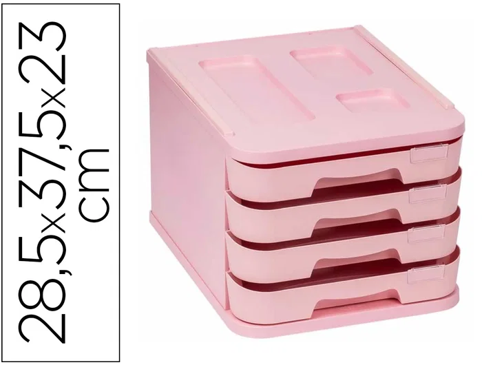 Mueble de plástico, fabricado en poliestireno, con cuatro cajones de coloramarillo pastel de 5 cm. para guardar documentos, con sistema de bloqueo, que evita la salida de los mismos. Con portaetiquetas en cada cajon. Dise ñado para apilarse de forma vertical formando un sólido bloque. Exterior gris, con dos tapas decorativas. Medida exterior: 285x375x230 mm. 100% Reciclable.