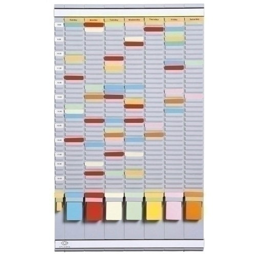 Juego de planificación semanal completo con tarjetas T y 35 ranuras. Contiene:7 elementos de tablero de planificación en formato 2 (48 mm), 1 panel índice en formato 1 (15 mm), 2 perfiles de conexión (472,5 mm), 8 tarjeteros, y 8 paquetes de tarjeteros en colores: blanco, rosa, rojo, naranja, amarillo, verde y azul. Incluye: tornillos, tacos e instrucciones de montaje.