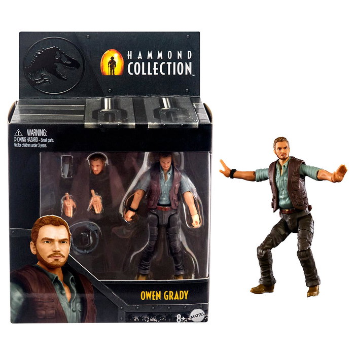 Esta figura de Owen Grady de la colección Hammond representa a ¡l personaje en la primera película de Jurassic World. La figura de 9,5 cm del intrépido entrenador de dinosaurios tiene un diseño fiel y 16 puntos de articulación. Viene con una cabeza y unas manos intercambiables para recrear su postura y expresión de "mando".