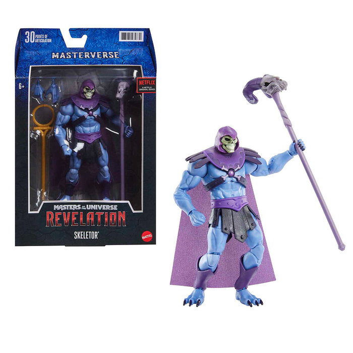 Masterverse es una nueva y emocionante línea de figuras de acción de Masters of the Universe, y su primera ola celebra el lanzamiento de un emocionante reinicio de Masters of the Universe: ¡Masters del Universo: Revelación, la serie animada de Netflix! En esta ocasión. la figura de 18cm. de Skeletor cuenta con al menos 30 puntos de articulación para adoptar todo tipo de posturas e incluye accesorios de batalla y manos adicionales. Los colores y la decoración pueden variar.