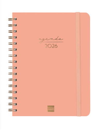 Agenda de espiral de tapa dura de cartón forrado con peliculado mate antirrayaduras. Diseño elegante y sofisticado con detalles estampados metalizados. Ideal para uso personal y/o profesional. Con goma elástica y esquinas microperforadas para localizar rápidamente el día/semana en curso. Incorpora un set de adhesivos temáticos. El diseño interior es limpio y fácil, con espacio suficiente para organizar tus proyectos, tareas y compromisos. Contiene información de interés en la anualidad y otros contenidos extra orientados a la organización personal. Formato similar a DIN A5; con las ventajas de una agenda portable y una de sobremesa. Duración: Enero 2026 - Diciembre 2026 (12 meses). Interior: Semana Vista Horizontal. Visión de la semana completa en horizontal que permite la escritura natural. Con espacio para concretar horario. Con información de los festivos de España. La anualidad de la agenda incluye la información relativa a: onomástica, festivos nacionales, cambios de estación e inicios de los años nuevos chino, musulmán, ortodoxo y hebreo. La agenda dispone también de otros contenidos extra: datos personales, calendarios, horarios, objetivos del año, plan anual, fechas importantes, otras fechas, hojas para checklist, hojas para notas, hoja para ocio, hojas para teléfonos, direcciones y e-mails y dos hojas de pegatinas orientadas a la organización personal. Artículo en español con anualidad multilingüe: español, euskera, gallego y catalán. Formato: E10 - 155x212 mm. Tapas de cartón forrado con peliculado mate antirrayaduras. Espiral doble metálica. Papel. 80 g/m². Papel FSC®.