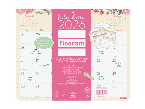 Calendario encolado con imán para superficies metálicas y agujero para poder colgarlo. Un almanaque de pared en papel FSC® ecológico de 120 g/m² con: onomástica, festivos nacionales, festivos de las CC. AA., días señalados, fases lunares y cambios de estación, también dispone de otros contenidos extra: calendario anual del año y del año siguiente, planning anual, listado de festivos de las CC. AA. y de las capitales de provincia e inicios de los años nuevos chino, musulmán, ortodoxo y hebreo. Medidas exteriores: 200 x 250 x 5 mm.
