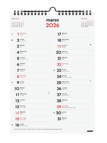 Calendario anual de pared encuadernado con espiral doble, colgador y papel FSC® ecológico de 120 g/m² para escribir en dos columnas. Interior: onomástica, festivos nacionales y de las CC. AA., días señalados, fases lunares y cambios de estación, calendario anual del año y del año siguiente, planning anual, listado de festivos de las CC. AA. y de las capitales de provincia e inicios de los años nuevos chino, musulmán, ortodoxo y hebreo. Medidas: 305 x 210 x 6 mm.