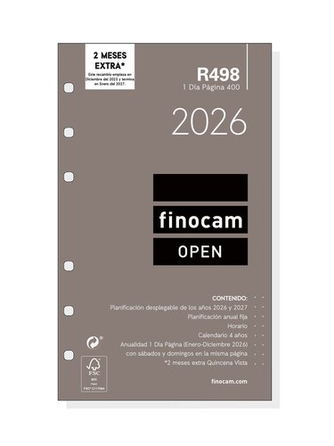 Finocam Recambio Anual Agenda Anillas Open R498 2026 1 Día Página 91x152 mm