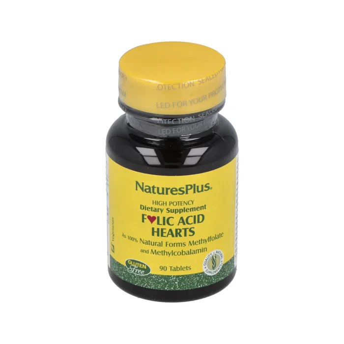 NATURES PLUS Ácido Fólico Hearts 90 Comp. con Vitaminas B6, B12 y Folato para Sistema Nervioso y Glóbulos Rojos, Vegano