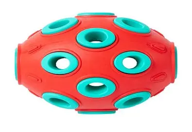 Juguete de goma de la marca Freedog con forma de balón de rugby. Mide aproximadamente 7,6 cm de ancho por 12 cm de largo. Ideal como juguete para perros.