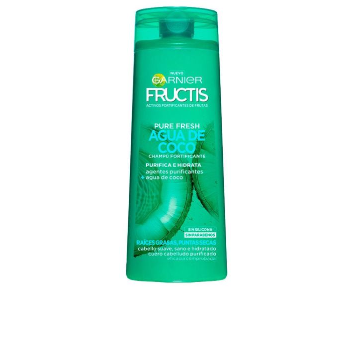 FRUCTIS PURE FRESH agua coco fortificante champú de Garnier, especialmente formulado para el cuidado del cabello con raíces grasas y puntas secas. Este champú innovador cuenta con una fórmula libre de siliconas y parabenos, enriquecida con extractos de agua de coco que purifican el cuero cabelludo y ofrecen propiedades hidratantes para los largos y puntas, asegurando que tu cabello reciba la nutrición necesaria sin agregar grasa a la raíz.