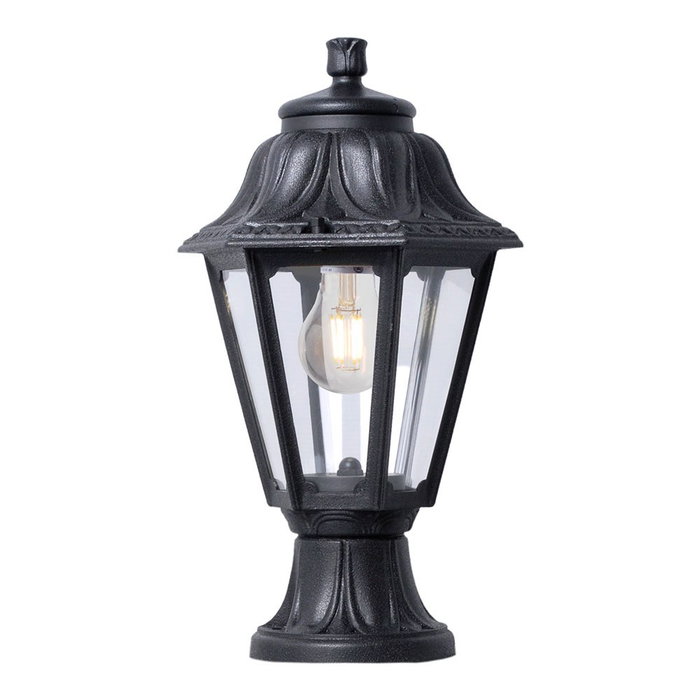 Farol sobremuro, modelo mikrolot/anna, color negro con cristal transparente, tensión 220 - 240 v ~50/60 hz, casquillo e27, máximo 23 w, longitud máxima bombilla 130 mm, bombilla no incluida, grado de protección ip55, hecho de resina resistente uv, anticorrosión y antióxido. incluye elementos de fijación. ø220 x 385 mm