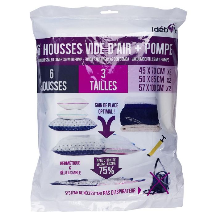 - Almacene de manera inteligente con este juego de 6 fundas herméticas que se comprimen con una bomba incluida. ¡Este conjunto le ofrecerá una reducción de volumen de hasta un 75% y podrá guardar fácilmente su ropa voluminosa en verano e invierno!
