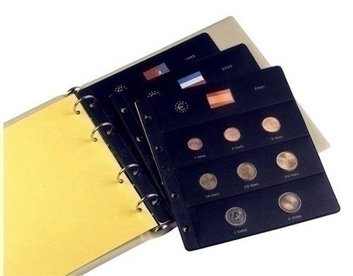 Fundas tipo claraboya para contener las monedas Euro, bandera del país y año. Con valores de cada moneda y el anagrama Euro. Con cartulina separadora. Con cartulina de 32 banderitas surtidas. Medidas: 186 x 210 mm.