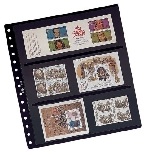 Fundas universales para sellos con 4 alojamientos por hoja y lámina central opaca negra/transparente a cada lado. Medidas: 295 x 270 x 5 mm.
