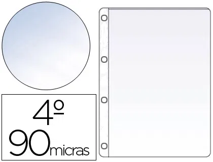 Para protección y archivo de documentos. Fabricada en PVC transparente no adherente. 4 taladros. Grosor: 90 micras. Tamaño 4º natural. La caja de 100 unidades.