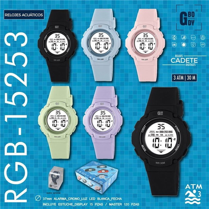 El reloj GBody LCD cadete, de la marca G&B TIME, es un accesorio práctico y juvenil que combina un diseño redondo y una correa blanca para un look deportivo y moderno.