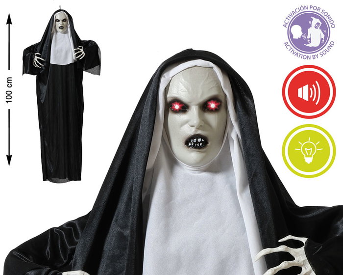 Esta figura colgante de monja maldita hará que cualquier espacio se transforme en una escena de horror. sus ojos rojos brillan al activarse por sonido, mientras emite sonidos espeluznantes. ideal para decorar pasillos oscuros, entradas o escenarios religiosos tenebrosos. sorprende a tus invitados y crea una ambientación de película de terror con esta presencia escalofriante.