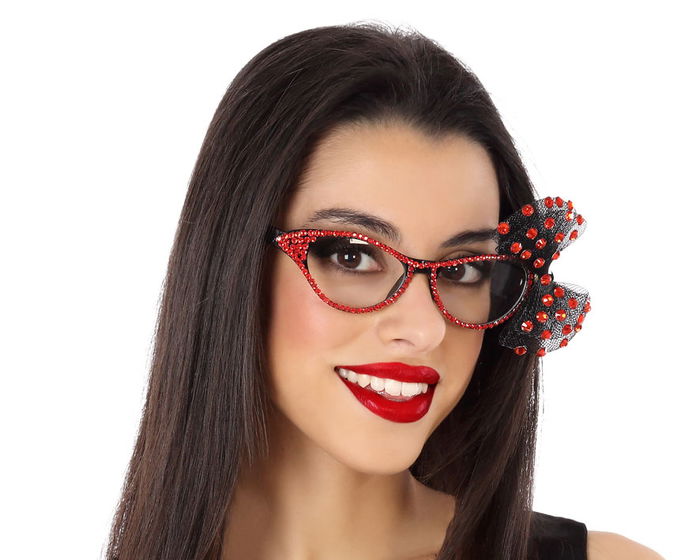 Añade un toque coqueto y femenino a tu look con estas gafas rojas de estilo pin-up. el gran lazo con pedrería aporta elegancia y originalidad, perfecto para fiestas de carnaval, despedidas de soltera o personajes vintage con mucho estilo.