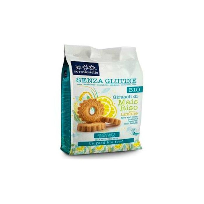 Indicaciones: Con un sabor alegre y soleado que recuerda su forma, los Girasoli de maíz y arroz son unas deliciosas galletas de mantequilla sin gluten. Alimento vegano.