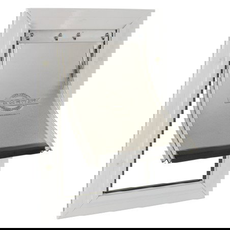 Puerta abatible, con cierre de seguridad. Apta para instalar en: puertas de madera, paredes de ladrillo, puertas de PVC o metal. Cuatro tamaños diferentes para gatos y perros desde menos de 3kg hasta para perros de más de 100kg.