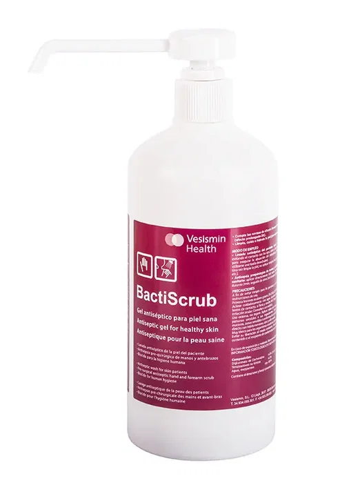 Gel de Clorhexidina al 4% Bactiscrub en formato de 500 mL de la marca Vesismin. Es un antiséptico y desinfectante de amplio espectro para la higiene de las manos.