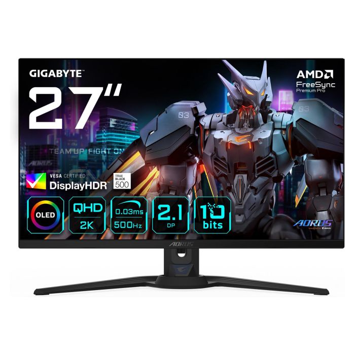GIGABYTE AORUS FO27Q5P Monitor Gaming OLED QHD – 2560 x 1440, 500Hz, 0,03ms, KVM, 300 cd/m², FreeSync Premium Pro, DisplayHDR True Black 500, DisplayPort 2.1, 68,6 cm (27"), 2560 x 1440 Pixeles, Quad HD, QD-OLED, 0,03 ms, Negro