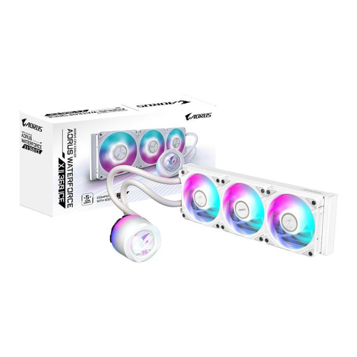 - El bloque de agua y el ventilador cuentan con iluminación degradada, y la iluminación del ventilador ARGB se puede sincronizar con otros dispositivos AORUS a través de GCC (GIGABYTE Control Center)