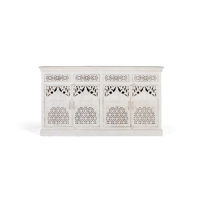 Aparador de 4 puertas y 4 cajones en madera de mango, con acabado blanco envejecido. Ideal para aportar un toque rústico y cálido a tu hogar. Altura: 90 cm, largo: 180 cm, ancho: 40 cm. Cada pieza es única, ya que al ser de madera natural puede presentar nudos, vetas y variaciones de color propias del material, lo que resalta su carácter artesanal y auténtico. Ideal para almacenar y exhibir objetos con estilo. Fácil mantenimiento: limpiar con un paño seco.