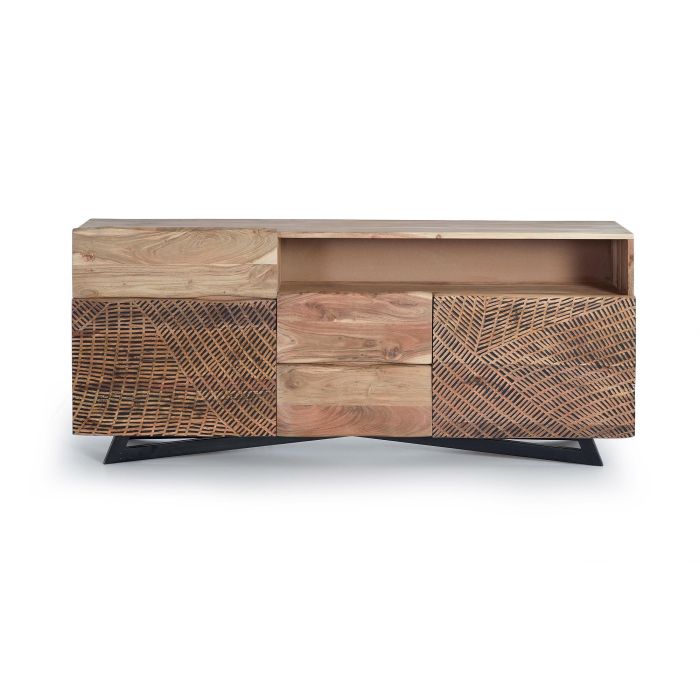 Aparador GINER Y COLOMER con 2 puertas y 3 cajones, fabricado en madera de acacia de alta calidad y base en metal para una mayor estabilidad. Los frontis de los cajones están tallados a mano con detalles artesanales, destacando su diseño único. Medidas de los frontis: 21 x 44 cm. Interior de los cajones: 14 x 40 x 27 cm. Puertas: 40 x 58 cm. Altura de los estantes: 17 cm. Altura de las patas: 10 cm. Debido a que es una pieza de madera natural y artesanal, puede presentar nudos, vetas y variaciones de color inherentes al material, lo que aporta autenticidad y carácter al mueble.