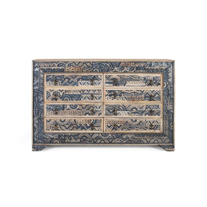 Aparador GINER Y COLOMER en madera de mango con acabado bicolor que combina tonos naturales y azul envejecido, creando un diseño llamativo y únicamente rústico. Cuenta con ocho cajones frontales decorados con tallas artesanales de inspiración tradicional, y tiradores metálicos en estilo vintage que realzan su estética bohemia. Ideal como mueble auxiliar en salones, comedores o recibidores, ofrece funcionalidad con un toque de elegancia artesanal. Con un diseño pensado para el uso diario, este aparador destaca por su calidad y detalles cuidadosos.