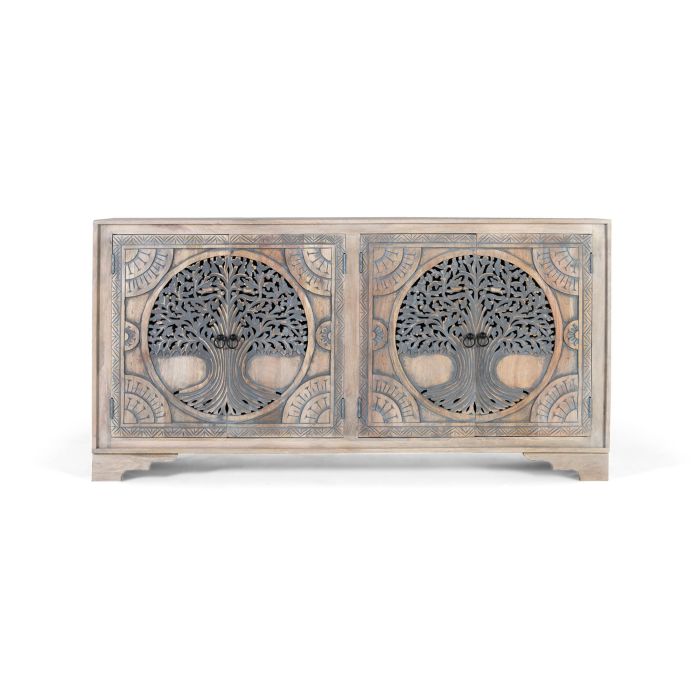 Este elegante aparador está fabricado en resistente madera de mango con acabado en tono natural y azul. Su diseño destaca por cuatro puertas ricamente talladas con motivos que evocan el árbol de la vida: dos figuras centrales llenas de simbolismo y detalle artesanal, complementadas por delicadas figuras geométricas en las esquinas que aportan equilibrio y armonía visual. En el interior, balda interior de 88x33 cm ofrece gran capacidad de almacenamiento. Los tiradores en forma de anilla refuerzan su carácter rústico. Altura de patas: 10 cm. Altura de estante: 34 cm. Medida de puerta: 70x40 cm. Tapiz de 1,6 cm. Limpieza recomendada: con un paño seco.
