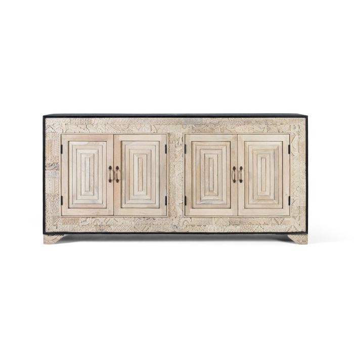 Aparador de Madera Maciza de Mango – Un diseño artesanal que combina elegancia y autenticidad. Cada detalle está cuidadosamente tallado a mano, destacando por sus paneles geométricos en el frente compuesto por cuatro puertas. Interior con baldas interiores para una organización funcional. La estructura enmarcada en color oscuro resalta el tono natural de la madera, creando un contraste sofisticado. Tiradores metálicos envejecidos en color bronce aportan un toque rústico-elegante. Ideal para espacios donde se busca calidad y personalidad.