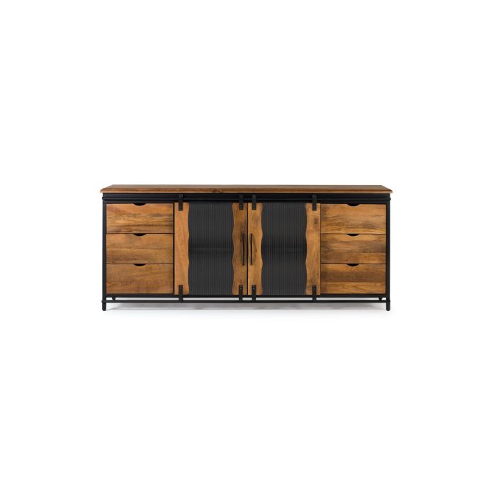 Aparador Industrial de GINER Y COLOMER – Ideal para añadir un toque moderno y funcional a tu hogar. Fabricado con madera de mango y metal, este aparador combina durabilidad y estilo. Cuenta con 2 puertas correderas y 6 cajones, ofreciendo una excelente capacidad de almacenamiento. Sus dimensiones son: 80 cm de alto, 190 cm de ancho y 40 cm de fondo. El diseño en combinación de colores negro y natural destaca por su elegancia contemporánea y versatilidad decorativa. Debido a su fabricación artesanal en madera natural, pueden presentarse nudos, vetas y variaciones de color que acentúan su autenticidad única.