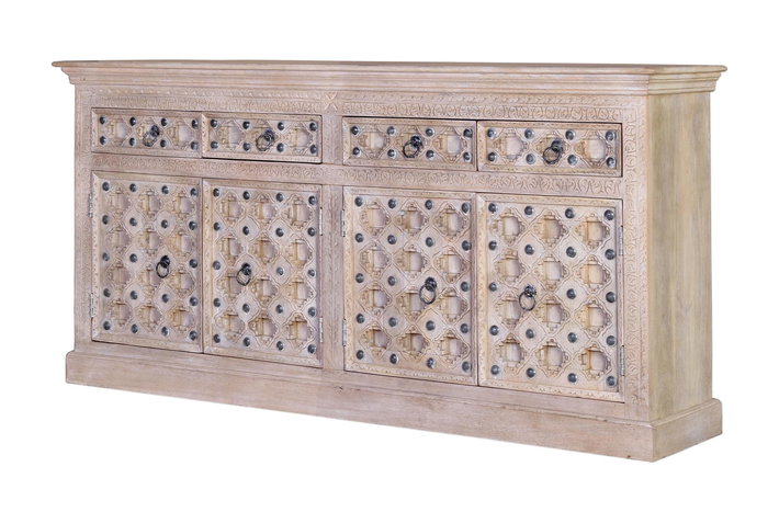 Descubre este extraordinario aparador de la marca GINER Y COLOMER, fabricado artesanalmente con madera de mango. Su diseño BAKRA presenta 4 puertas con estantes interiores y 4 cajones, todo realzado con remates de tornillos envejecidos. Luce un acabado lavado blanco que destaca la belleza natural de la madera.