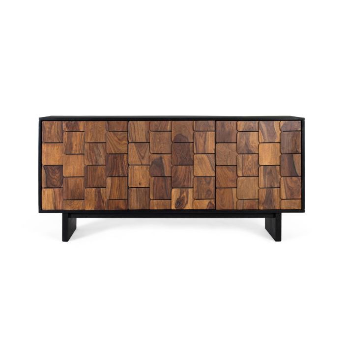 Aparador contemporáneo GINER Y COLOMER con estructura y base en madera de mango, acabado en color wengué-nogal. Frente compuesto por tres puertas realizadas en madera de sheesham, con diseño de piezas en relieve que resaltan la veta natural y generan un efecto tridimensional. Interior con tres baldas funcionales (altura: 26,5 cm, ancho: 52 cm, fondo: 34 cm), optimizando el espacio de almacenaje. Puertas con sistema de apertura tipo push y bisagras cazoleta, cerrado con cierre rodillo. Base robusta, ligeramente elevada (patas de 14 cm), con líneas rectas que aportan ligereza visual y facilitan la limpieza. Madera de mango y sheesham tratada con barnizado/lacado. Material sostenible. Requiere montaje e incluye herrajes. Ideal para uso doméstico.