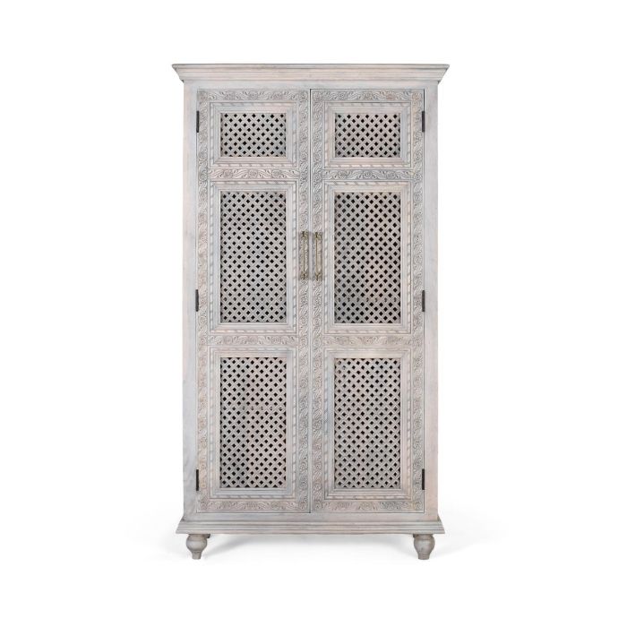 Armario fabricado en madera maciza de mango, reconocida por su resistencia y vetas únicas. El frente presenta un trabajo de talla artesanal, mientras que las puertas, también talladas y perforadas, aportan un toque de elegancia y armonía visual. Su interior cuenta con cuatro balda espaciosas de 92x34 cm, ideales para organizar tu ropa o accesorios. Las patas torneadas, de 12 cm de altura, le dan un acabado equilibrado y natural. El acabado blanqueado o decapé claro realza su aspecto envejecido y auténtico. Medidas: puertas 157x34 cm, altura de estantes 38 cm, tapa 6 cm. Ideal para cualquier espacio con estilo rústico o natural. Madera de mango – Color: Blanco lavado – Cuidado: LIMPIAR CON UN PAÑO SECO – Número de bultos: 1.