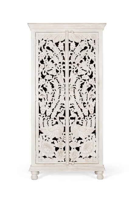 Este gabinete de madera maciza de mango presenta un encantador acabado en blanco envejecido, que muestra su carácter rústico. Las dos puertas talladas a mano se abren a tres estantes interiores, lo que proporciona un cómodo espacio de almacenamiento. Con unas dimensiones de 180 cm de alto, 90 cm de largo y 40 cm de ancho, este mueble ofrece funcionalidad y estética.