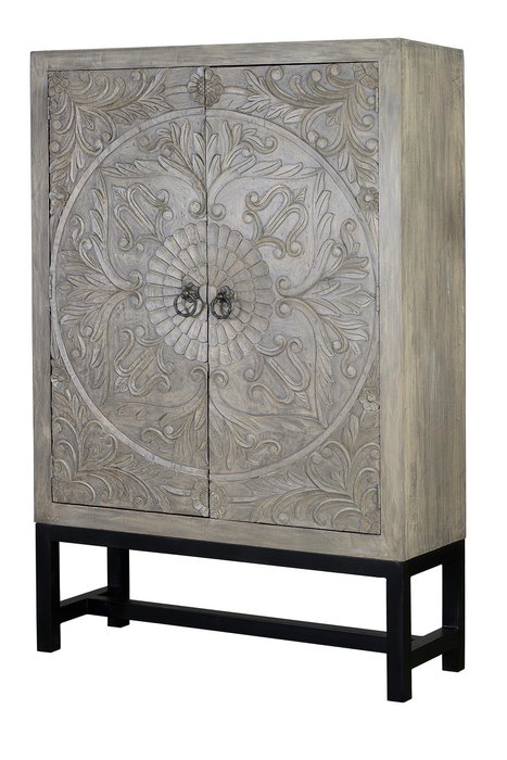 Espectacular armario de 2 puertas construido en madera maciza de mango con base de hierro, de la marca Giner y Colomer. Cuenta con dos estantes interiores y una talla decorativa de sol con flores en las esquinas. Presenta un acabado gris patinado que refleja una imagen de antigüedad.