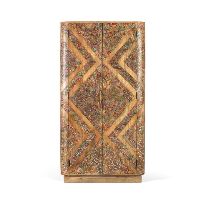 Armario de madera de mango maciza, con diseño imponente y detalles artesanales en sus dos puertas frontales, destacando por incrustaciones multicolores y pequeños espejos que generan un efecto vibrante y rico en textura visual. Su estructura compacta y vertical lo convierte en una pieza funcional ideal para almacenar, al tiempo que actúa como elemento decorativo central en salones, dormitorios o recibidores. Incluye barra colgadora para mayor versatilidad.