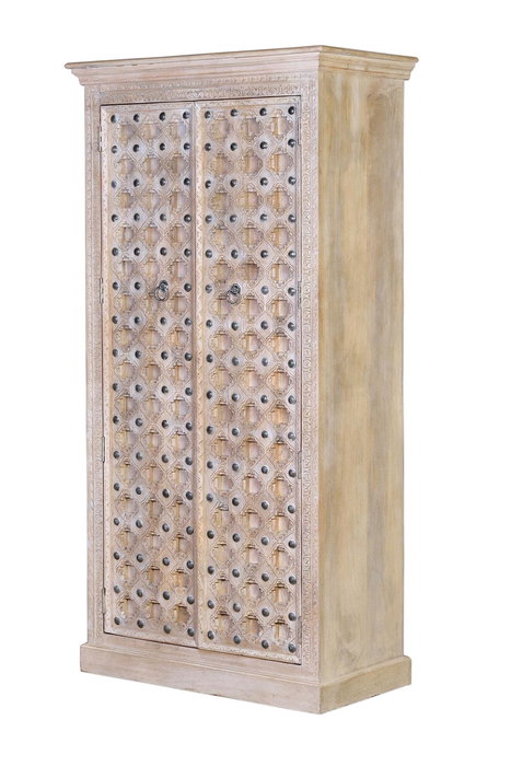 Armario de dos puertas y tres estanterías interiores fabricado artesanalmente en madera maciza de mango, siguiendo el diseño manual BAKRA de Giner y Colomer. Presenta un atractivo acabado blanco lavado y detalles con tornillos gruesos en las puertas.